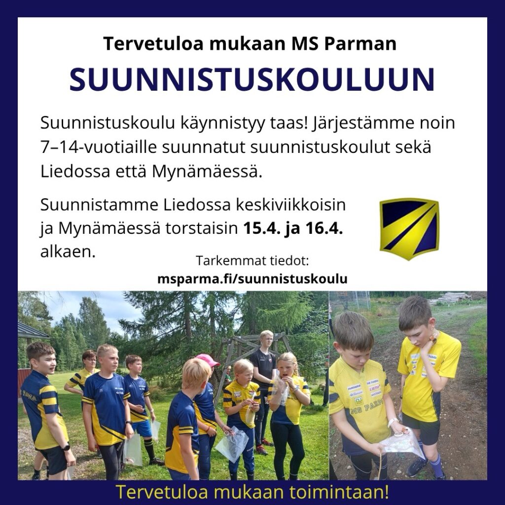 MS Parman lapsille suunnatut suunnistuskoulut alkavat huhtikuussa. Suunnistuskoulu järjestetään Liedossa keskiviikkoisin 15.4. alkaen ja Mynämäessä torstaisin 16.4. alkaen.